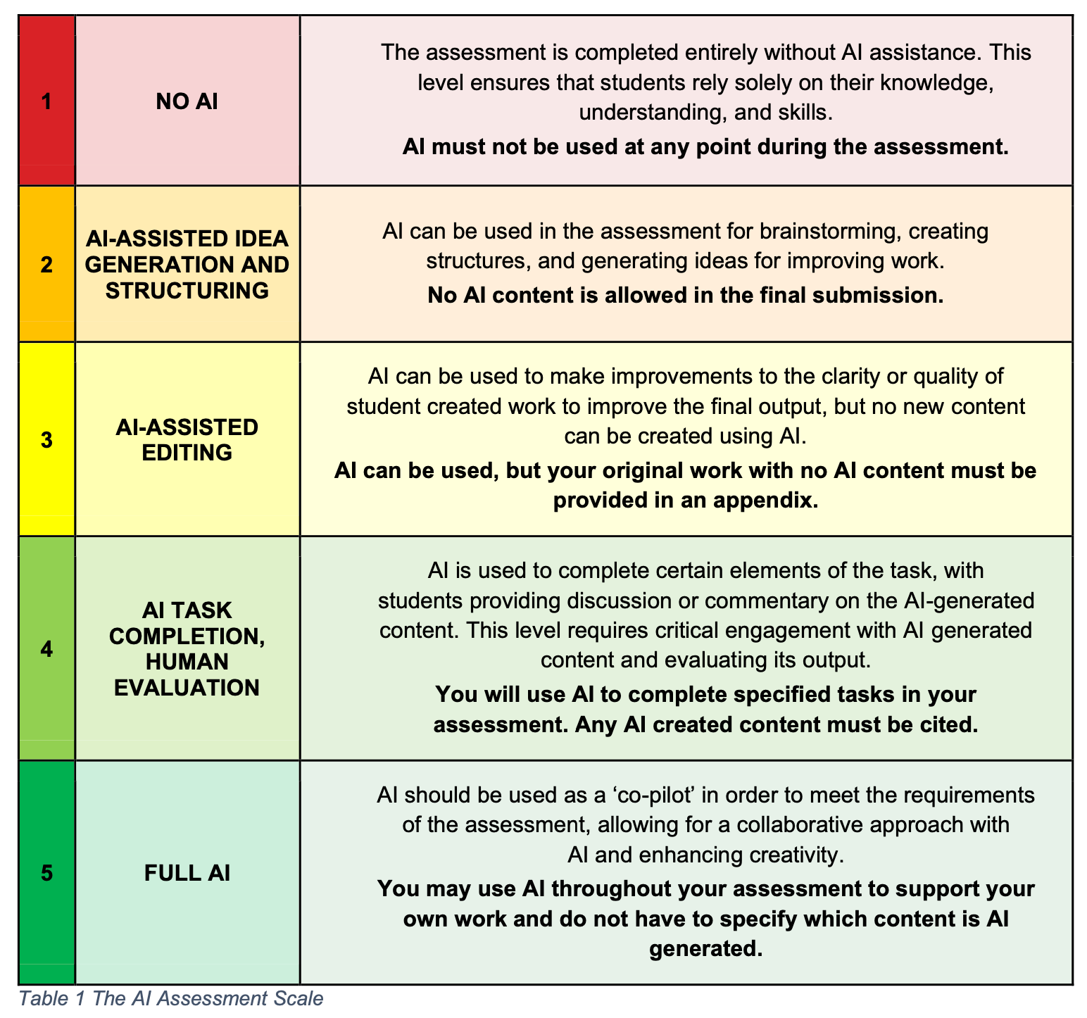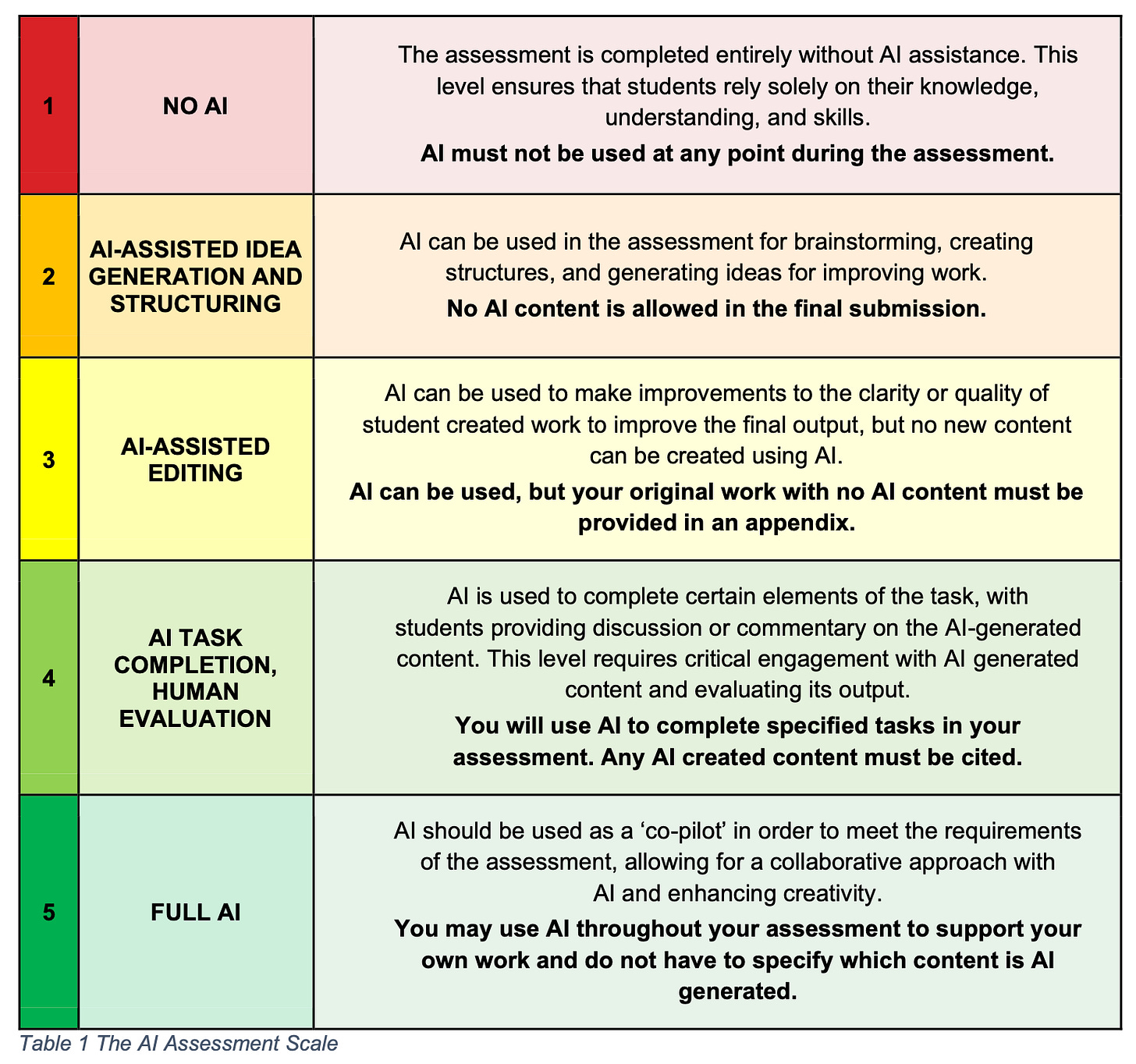 Perkins, M., Furze, L., Roe, J., MacVaugh, J. (2024). The Artificial Intelligence Assessment Scale (AIAS): A Framework for Ethical Integration of Generative AI in Educational Assessment. Journal of University Teaching and Learning Practice, 21(6). https://doi.org/10.53761/q3azde36